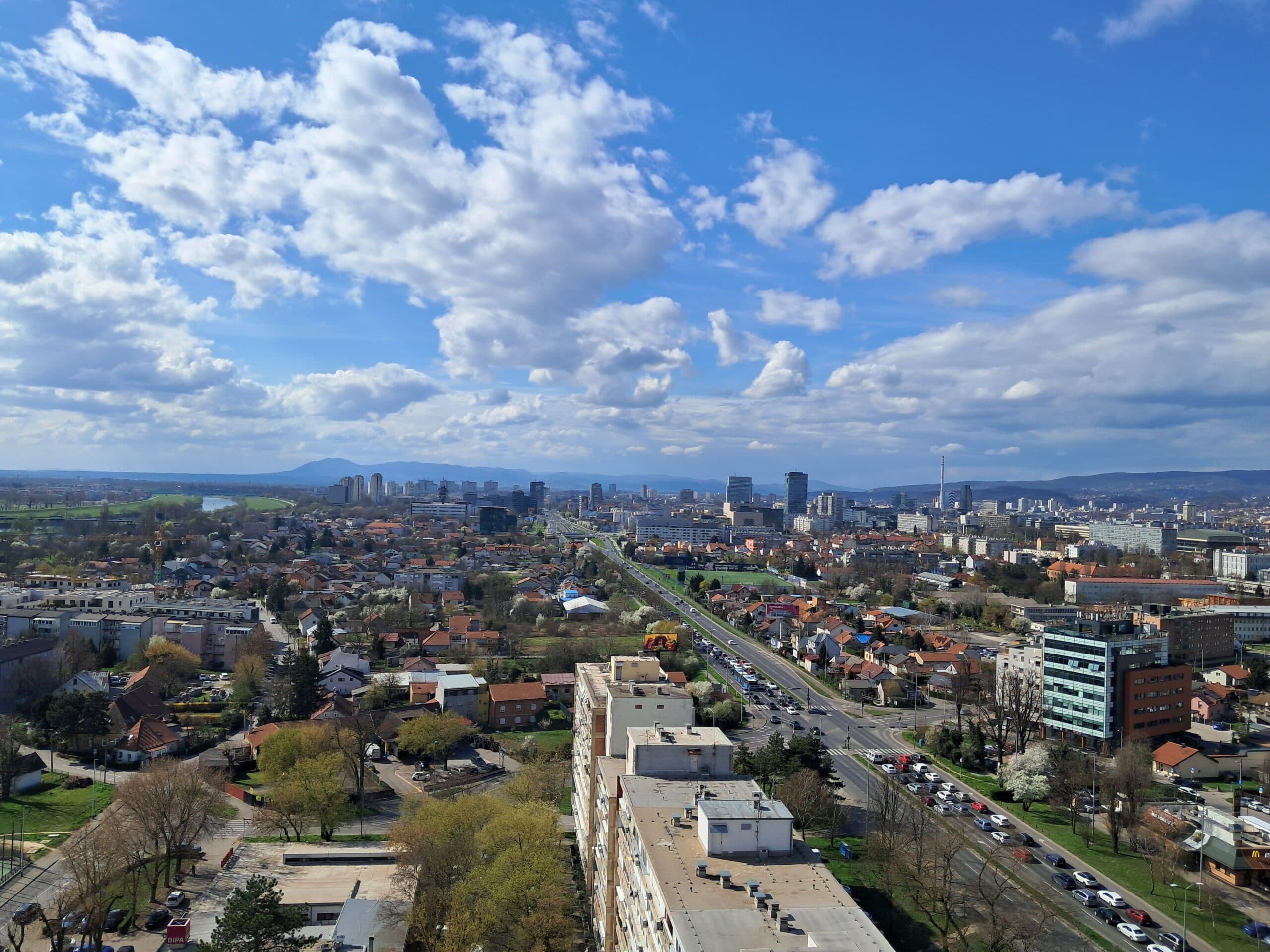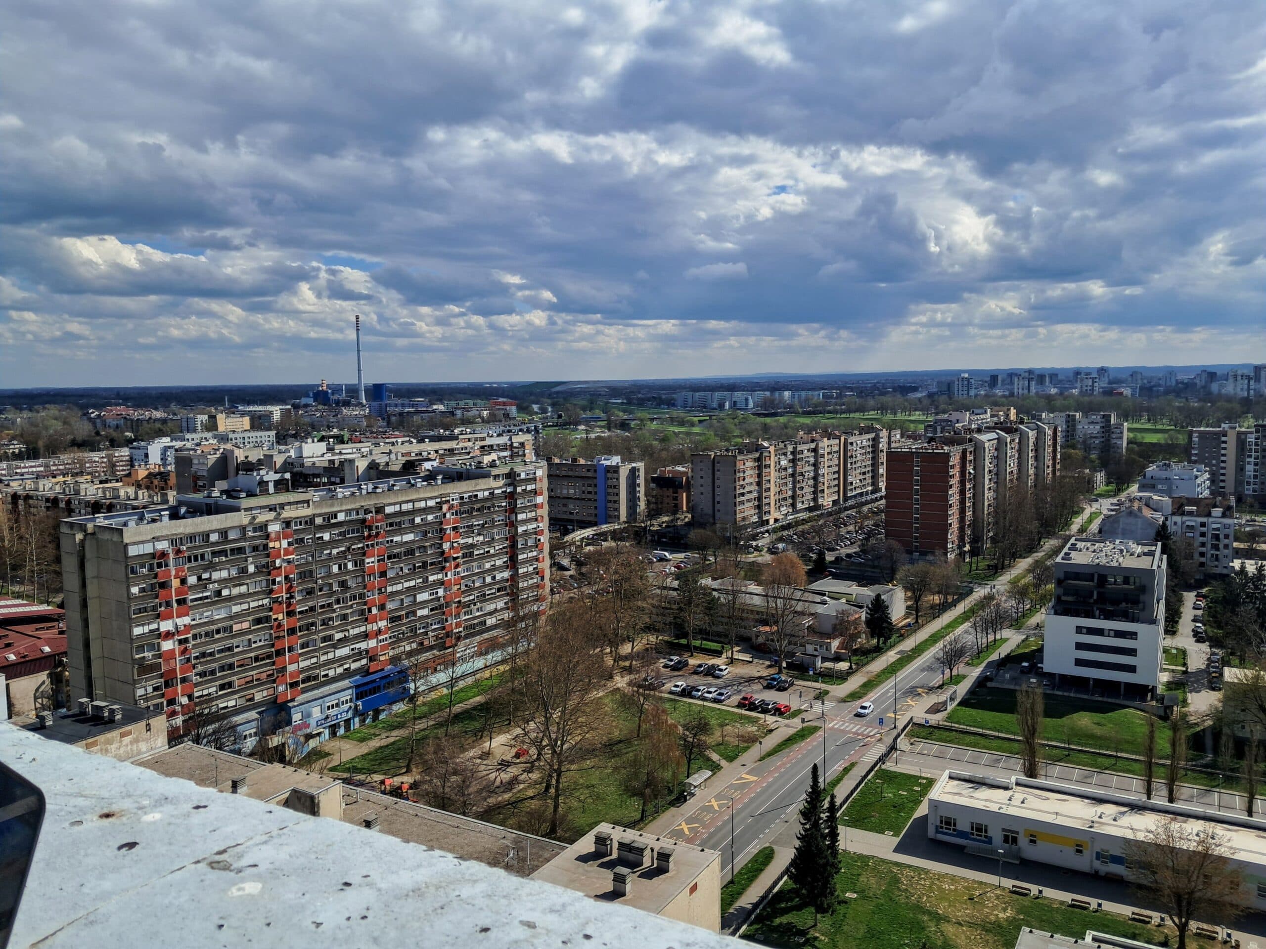 Pogled na južni dio Savice, dimnjak toplane i zgrade Zapruđa. [SM 2026.]