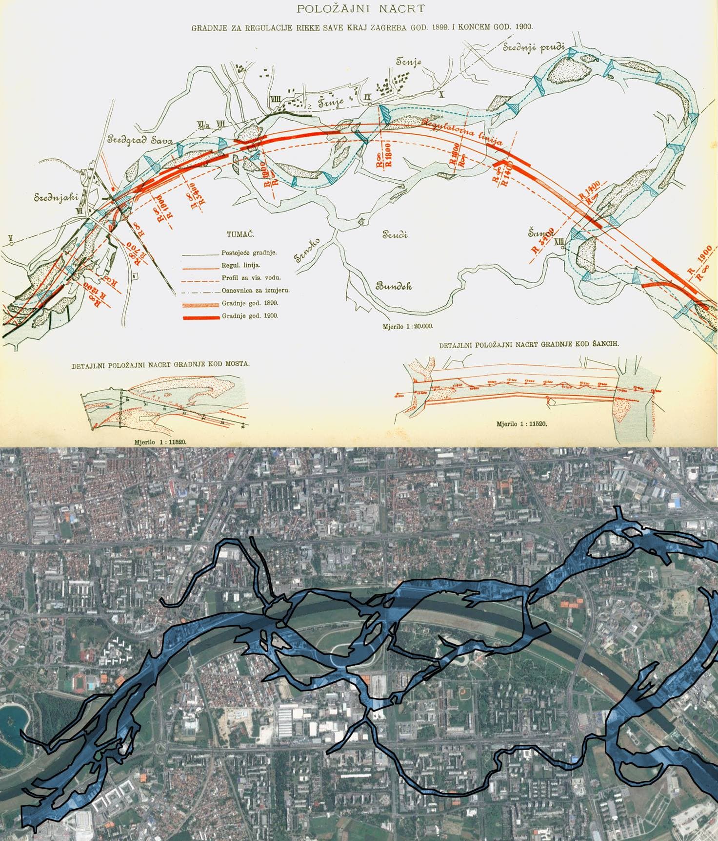 Usporedba nacrta toka Save iz 1899./1900. godine te sadašnjeg toka Save. [VR 2026.]