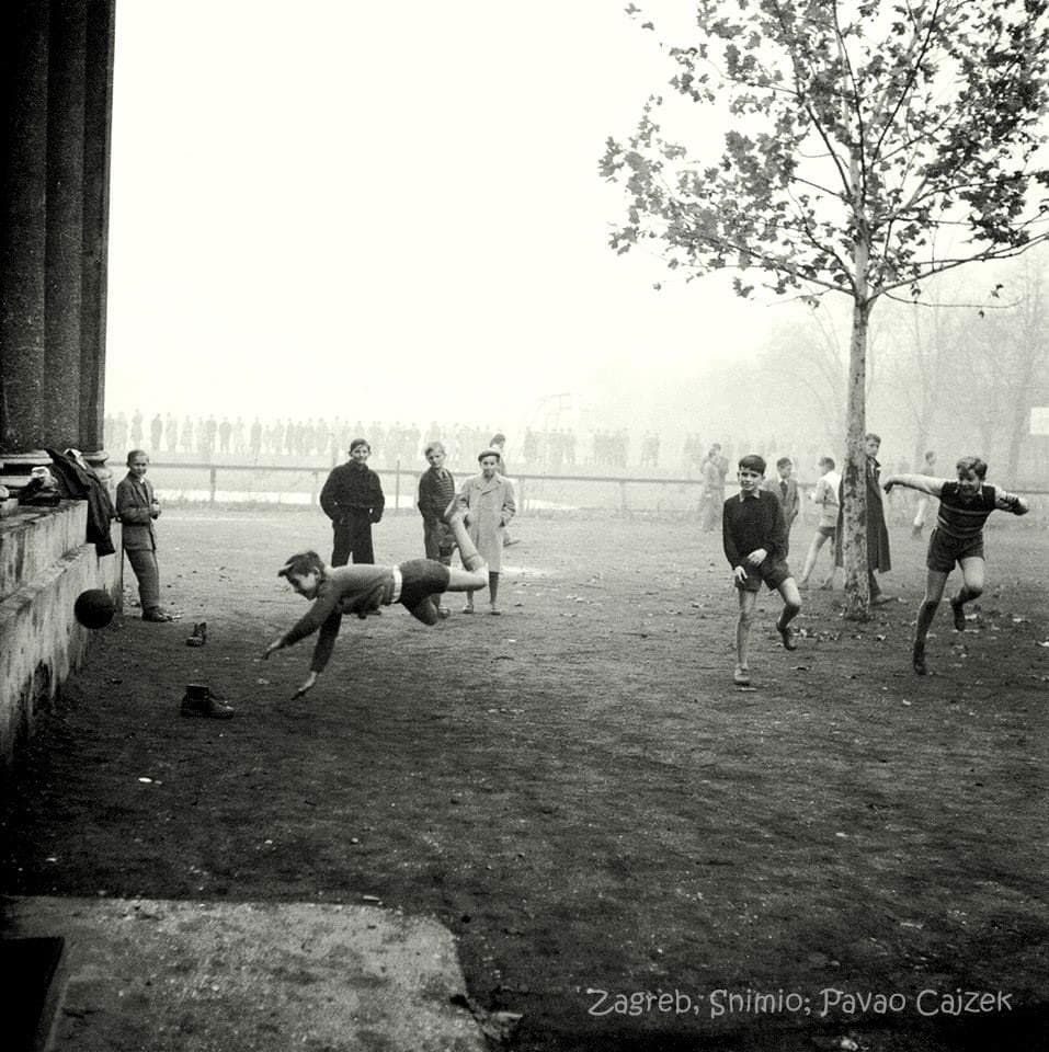 Nogomet na Srednjoškolskom igralištu. Snimljeno 1953., snimio Pavao Cajzek. [FB-ZG 2025.]